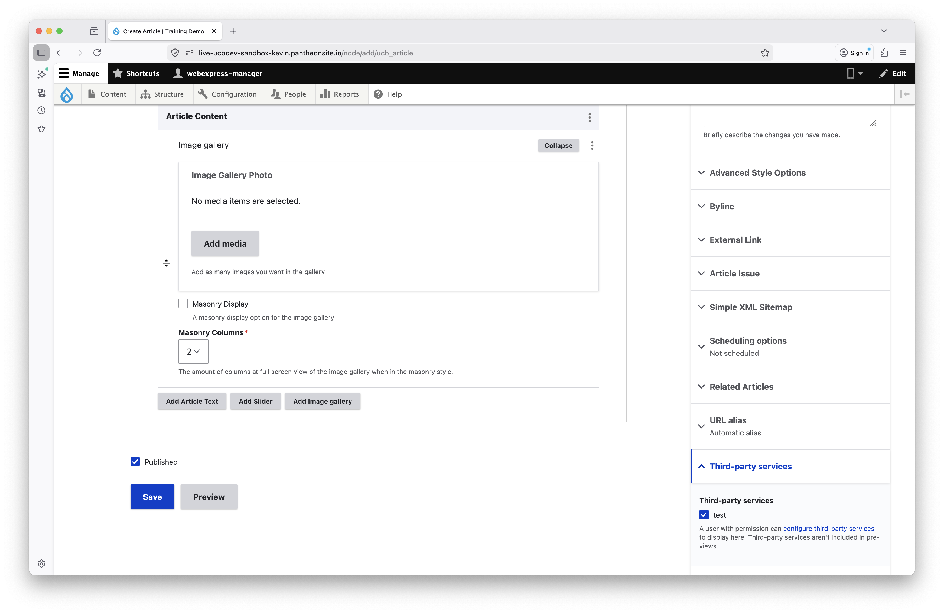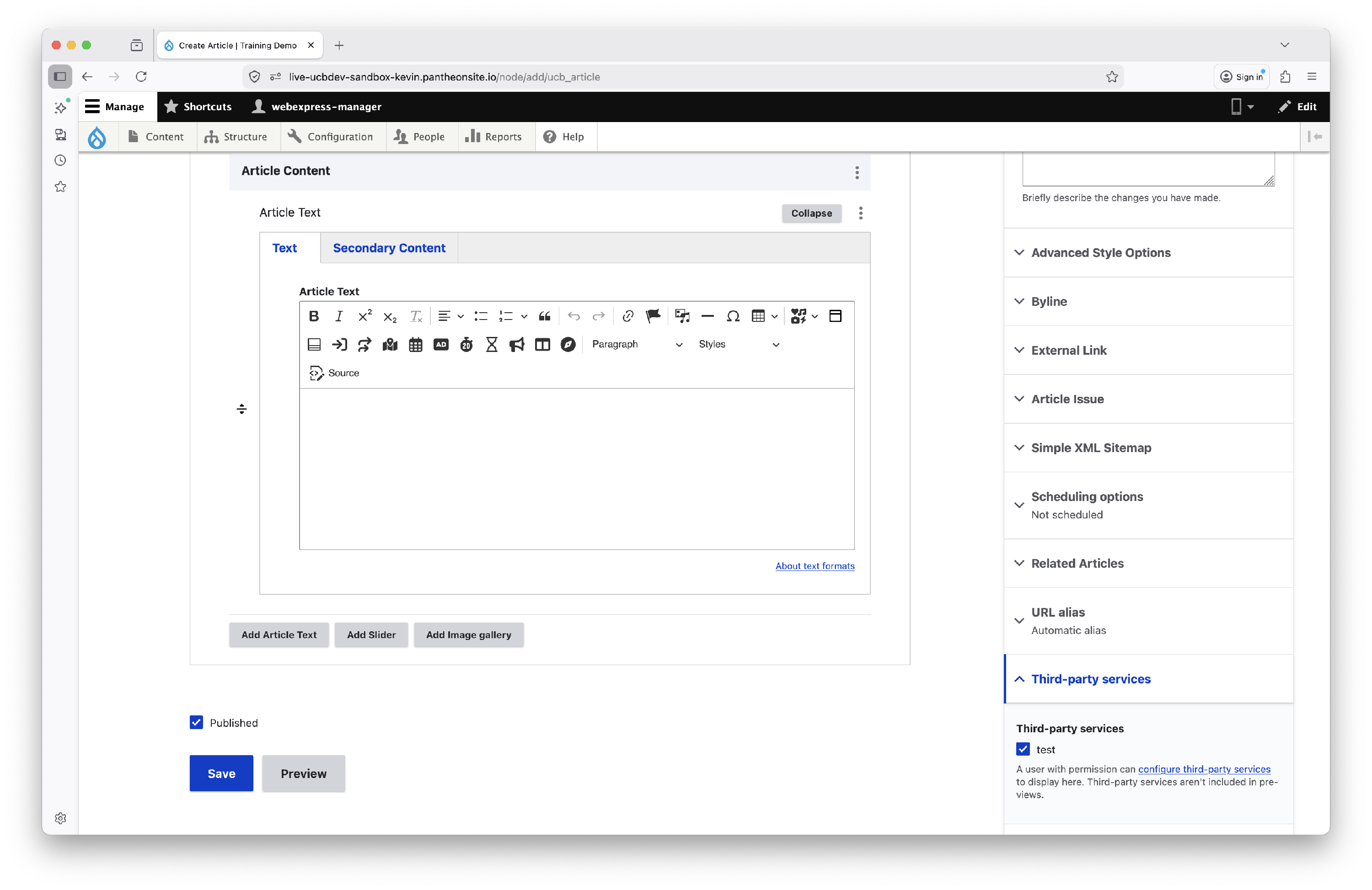 Article sections have three options: