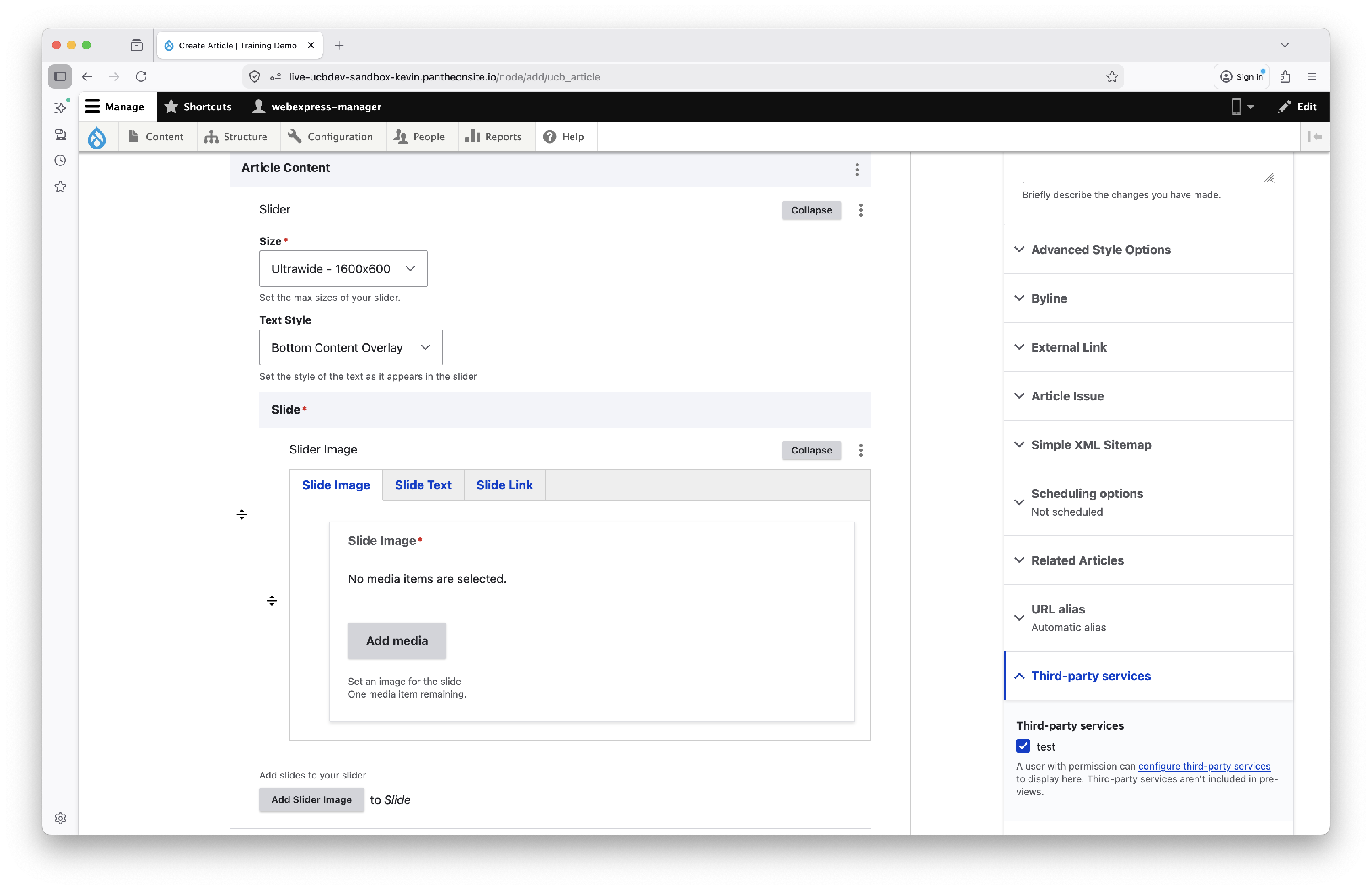 To add the article slider, click the Add Slider button