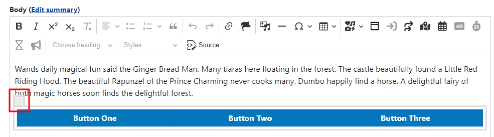 - Your button will display in the body of the page with a flashing cursor. You may start typing in the button text.