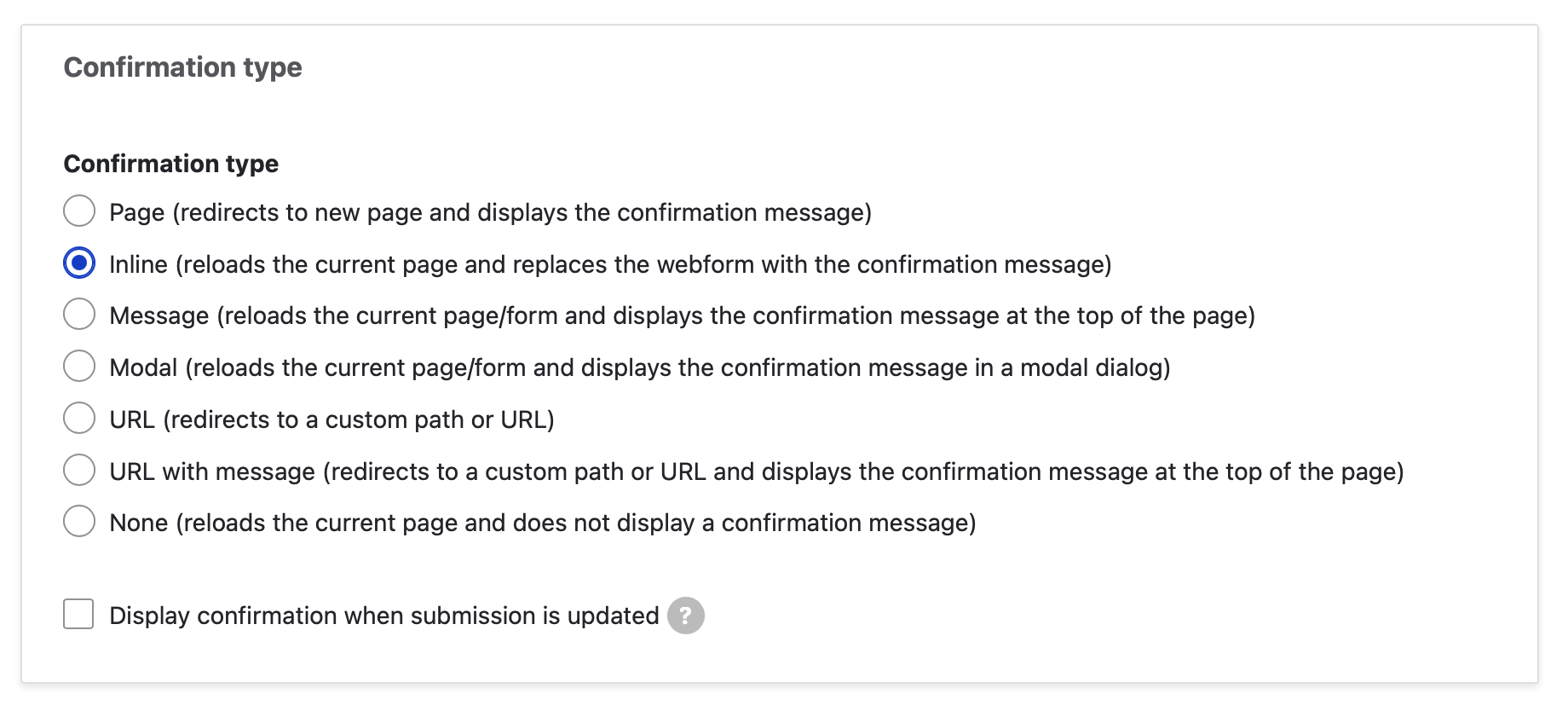 We're recently seen an issue where using the "Inline" option for form confirmation settings will cause duplicate submissions to be recorded when a form is submitted. Until we can find out more about why this setting is causing this issue, we would recommend using the "Page" or "Message" option instead.